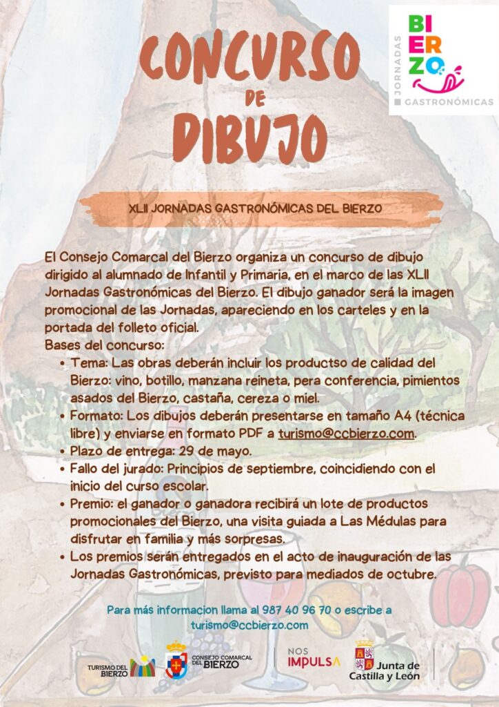 El Consejo Comarcal del Bierzo ha puesto en marcha una nueva edición del concurso de dibujo dirigido al alumnado de educación infantil y primaria, en el marco de las XLII Jornadas Gastronómicas del Bierzo. La obra seleccionada se convertirá en la imagen promocional del evento, protagonizando los carteles y la portada del folleto informativo; así como de las campañas de publicidad.